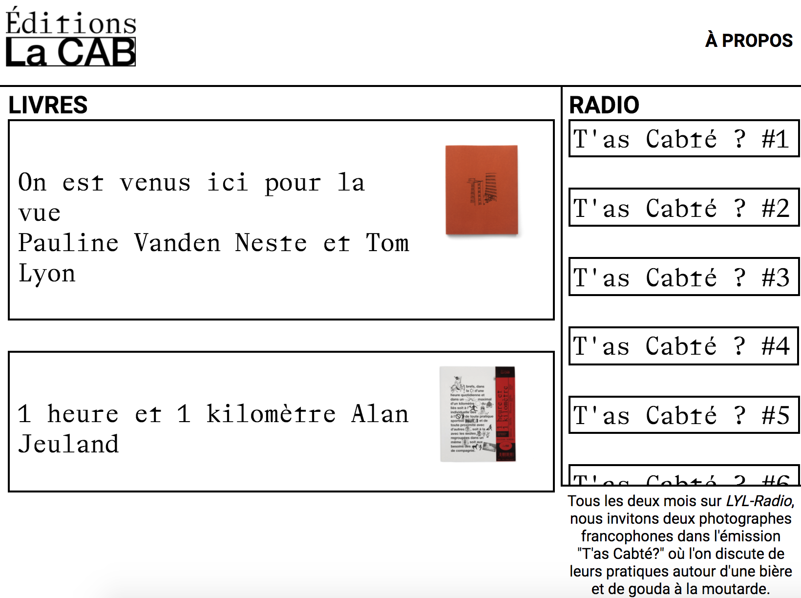 ILS ENREGISTRENT LES PODCASTS « T’AS CABTÉ » DIFFUSÉS SUR LYL RADIO AUTOUR DE LA PHOTOGRAPHIE DOCUMENTAIRE. AVEC LES ÉDITIONS LA CAB, ILS PUBLIERONT « ON EST VENUS ICI POUR LA VUE » DE PAULINE VANDEN NESTE ET TOM LYON SÉLECTIONÉ AU BELGUIM PHOTOBOOK ARLES ET PLUS RÉCEMMENT «LA NUIT, TU MENS» DE AMBRE HUSSON.